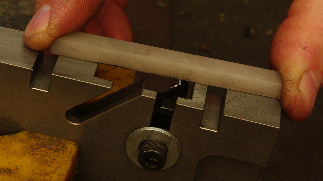 Following the instructions that came with the jig, install the hammer and sear in the jig to find the correct angle for the sear. Then move it to the stoning slot and carefully cut and polish the primary angle. Then move the sear holder to the angled slot and cut and polish the secondary angle.