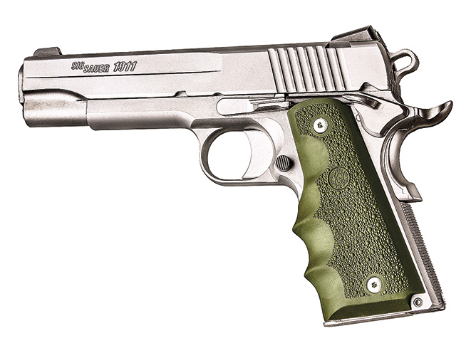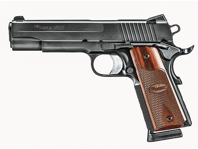 Sig Sauer’s high-end 1911 pistols come dressed in the company’s wood grips, which are also available for other full-sized 1911s. These rosewood grips fit both full-sized and Commander models, and they feature smooth wood where your thumb transits to operate the safety as well as diamond checkering with a large diamond design for the actual grip surface.