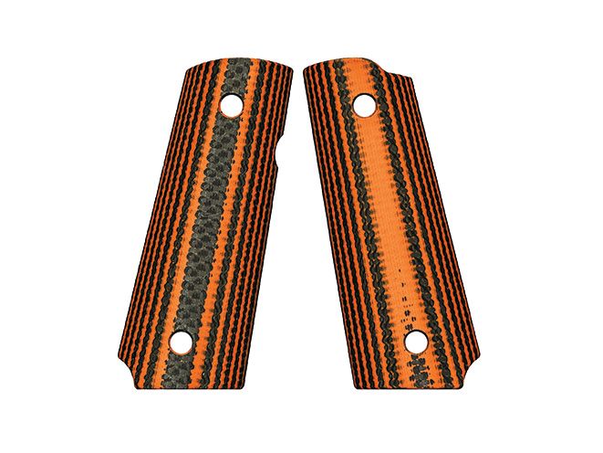 VZ Grips for the 1911 come in a huge variety of colors and materials, from traditional double-diamond designs in wood to these carbon-fiber grips in blue, white, orange and more. Many are available with a thumb scoop for enhanced handling.