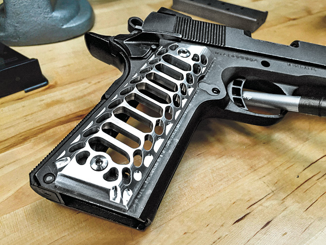 These aggressively machined grips are dramatic and rather unique: The holes go all the way through to the magazine well. The lower edges are beveled to aid concealability, and the grips are available with or without the ambidextrous safety cut. Valkyrie Dynamics’ grips are CNC-machined from a billet 6061-T6 aluminum and other radical options are available.