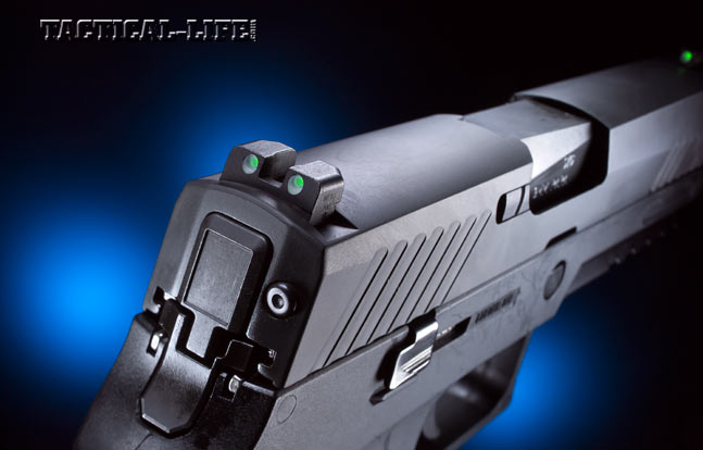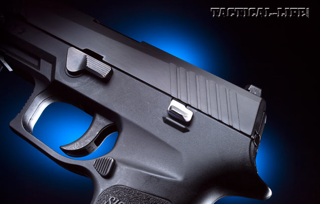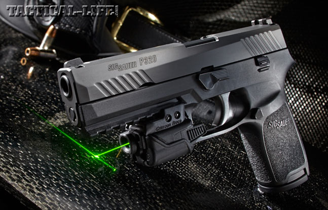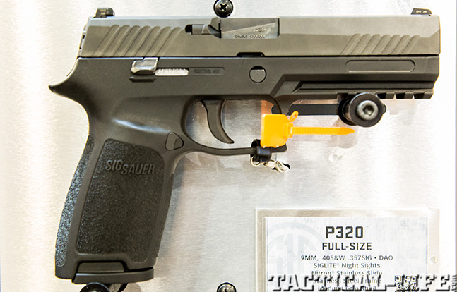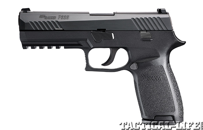 The polymer-framed, striker-fired Sig Sauer P320 duty pistol is customizable to any sized hand with a modular grip frame and a removable fire control assembly. It can quickly be converted from a full size to a carry pistol, while the slide and barrel conversions allow the P320 to change calibers—9mm, .40, .357 SIG, and .45 ACP—as well as a variety of barrel lengths.