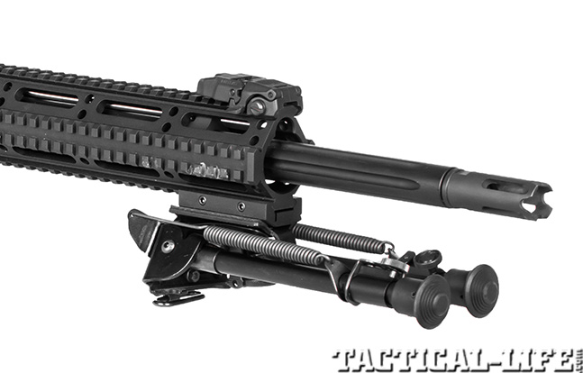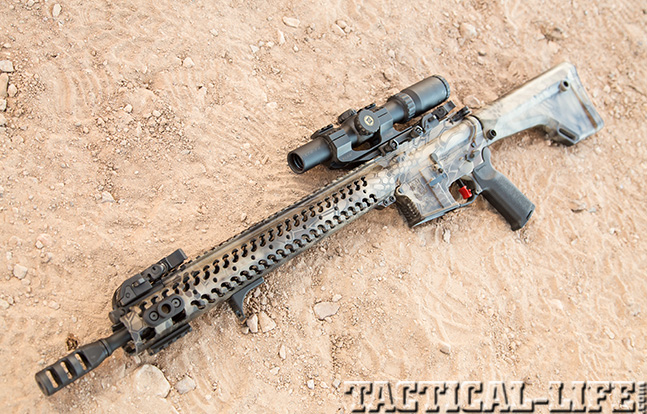 Seekins Precision’s 7.62mm AR weighs in at 9.5 pounds unloaded and without optics. The company’s first 7.62mm rifle offers ambidextrous features, including the bolt release, magazine release, selector switch and charging handle. The SR25-pattern lower receiver will accept all SR25-style magazines as well as 7.62mm Magpul PMAGs. The upper receiver’s rail extends approximately 1.5 inches to allow for more optic mounting locations. The flat-bottomed 3-Gun Rail is 15 inches long and is designed to be placed on top of a barricade for a stable shooting platform.