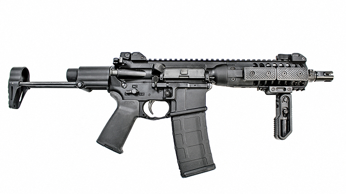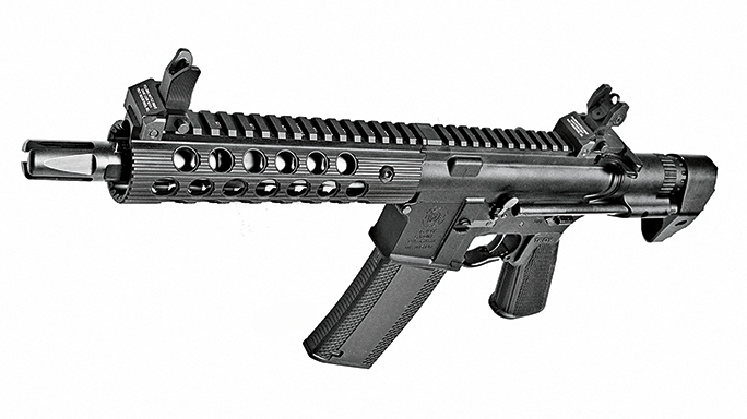 A recent introduction to the Rock River Arms stable of thoroughbreds, the LAR-15 PDW A4 SBR uses a North Eastern Arms Compact Carbine Stock as well as a 10.5-inch barrel to reduce the overall size of this package to just 24 inches. Magazines are standard AR-15/M4 style, and the gun is chambered in 5.56mm NATO. The handguard features a built-in folding foregrip as well as rails for accessories in the 3, 9 and 12 o’clock positions. For more information, visit rockriverarms.com or call 866-980-7625.