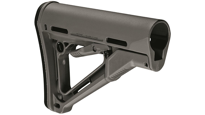 One of the most popular stocks on the market, the Magpul CTR mounts easily on mil-spec carbine receivers. The sloping cheekweld provides a contoured profile for user comfort while the shielded release latch prevents snagging and accidental engagement when handling. This stock is aces when it comes to reliability, durability and cost.