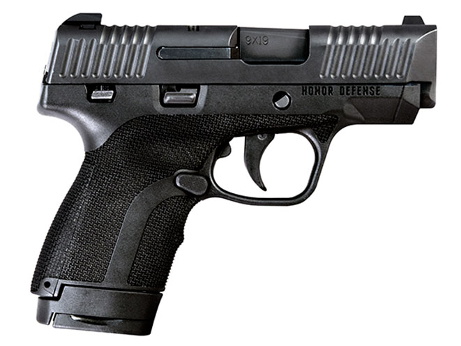 One of the “new kids on the block,” Honor Defense makes its pistols in the U.S.A., with all-American components. The company’s Honor Guard in 9mm is one on the slimmest made at 0.96 inches, with a weight of 22 ounces and an overall length of 6.2 inches. This small pistol has several unique features like front and rear serrations that go over the slide, a rear sight that is flat in the front should it be needed to help retract the slide one-handed, an ambidextrous slide catch and magazine release, backstraps in two sizes, and seven- and eight-round magazine. There’s also a version with a manual safety and a FIST frame to provide blunt force. (http://www.honordefense.com; 678-943-8035)