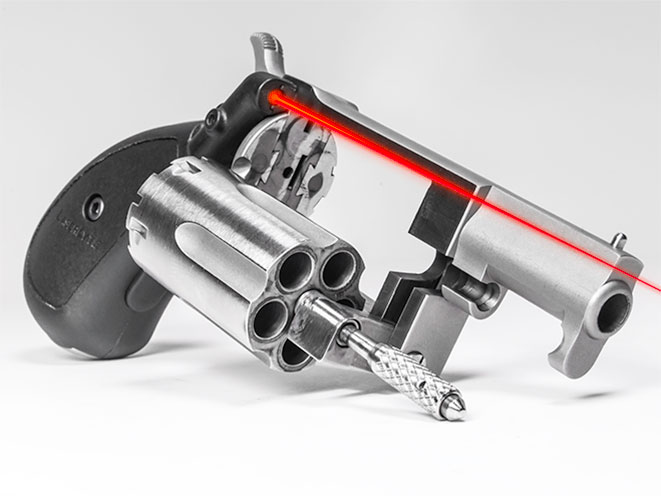 North American Arms’ .22 WMR Sidewinder earned its name because, like most modern double-action revolvers, it has a cylinder that swings out to the side for loading. The Sidewinder has a 1.5-inch barrel, stainless steel construction, an overall length of 5 inches, a height of 2.87 inches and a width of 1.06 inches. It’s a single-action design, which means it has to be cocked for each shot, but the hammer spur is easily accessible and serrated, and it has a serrated spur trigger. A version with a LaserLyte Mighty Mouse laser installed (shown) is also available. (http://www.northamericanarms.com; 800-821-5783)
