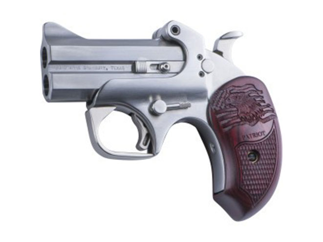 The Patriot from Bond Arms features a stainless steel double-barrel assembly and frame. The derringer is chambered for .45 LC/.410 rounds, and the 3-inch barrels are interchangeable with Bond Arms’ other barrels. The Patriot features Bond’s patented rebounding hammer, retracting firing pins and a crossbolt safety. It weighs 21.5 ounces unloaded and has rosewood grip panels. A driving holster is included. (http://www.bondarms.com; 817-573-4445)