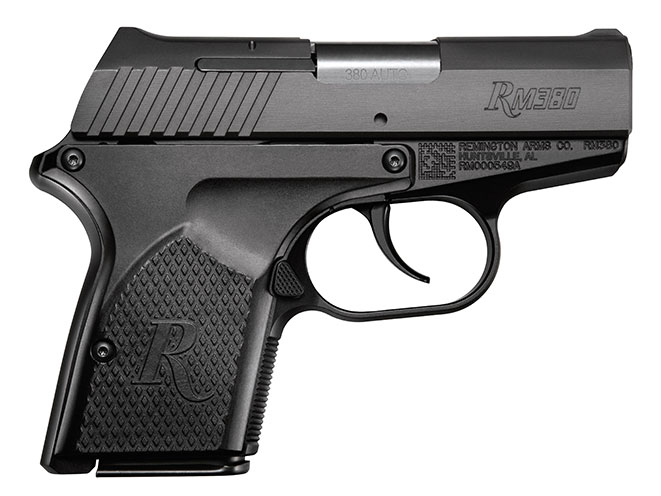 This diminutive pistol is a mating of steel and aluminum alloy. It weighs a scant 12.2 ounces unloaded while offering a 6+1 capacity of .380 ACP ammo. It has a smooth, 10-pound DAO trigger; a fully functional slide stop; an ambidextrous magazine release; and glass-filled nylon grips that are checkered like the frontstrap. It can also be had with a Crimson Trace laser sight mounted on the triggerguard, which adds little weight or bulk. (http://www.remington.com; 800-243-9700)