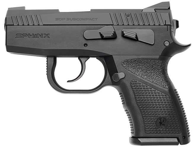 With a steel slide and an aluminum alloy frame, the Sphinx SDP Subcompact Alpha is precision machined and hand fitted to provide maximum accuracy while remaining highly concealable. Weight just 25 ounces, this pistol has a 3.13-inch barrel, full-length guide rails, a match-grade trigger and a 13+1 capacity in 9mm. More features include front and rear slide serrations, fixed sights, an ambidextrous safety/decocker, a reversible magazine catch and an enlarged, undercut triggerguard.