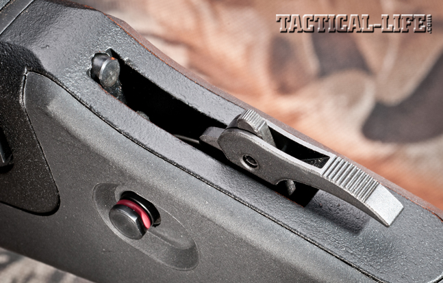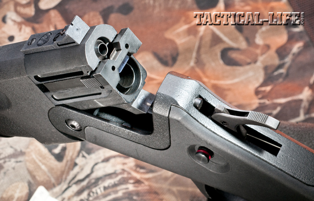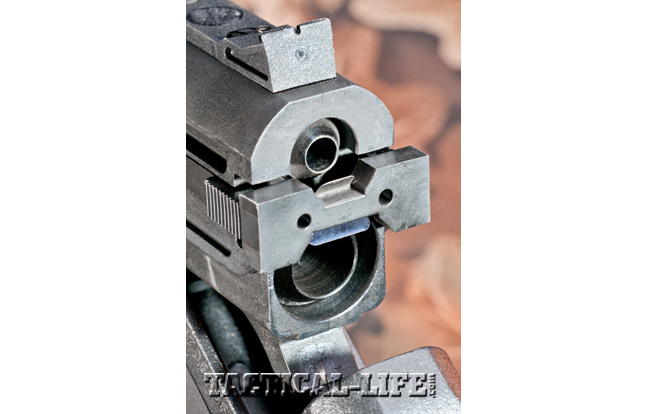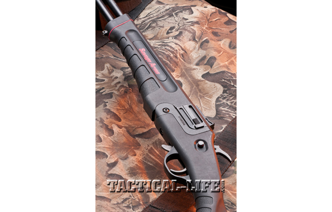 Extraction is also totally independent of the action opening; in line with the no-frills utility theme of the Model 42, the extractor is actually a two-piece assembly with one single stamped-sheet-steel part attached to the polymer sliding manual extractor body and bent to engage both the rimfire case rim above and the shotshell rim below when pulled to the rear by the thumb and forefinger. The “ejector” is your fingernail. This gun isn’t meant to be used on the battlefield; you can expect it to shoot decently—just make sure your aim’s good because you won’t get a quick follow-up shot with the same barrel. “Spray ’n pray” does not apply here.
