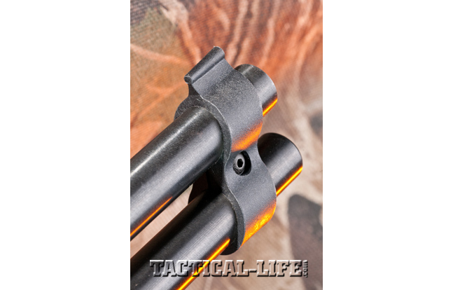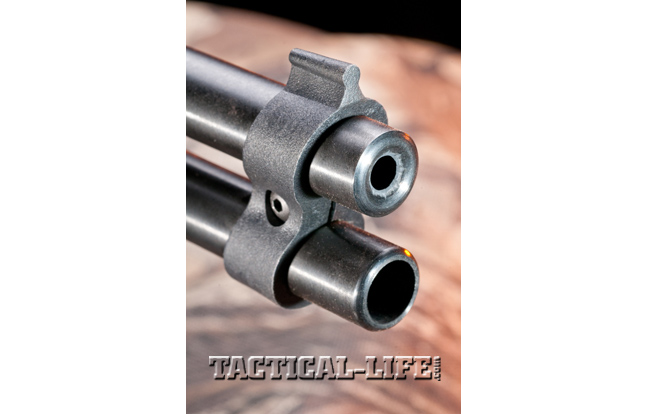 Up on top, the little Savage is fitted with black polymer sights. The front blade is an integral part of the barrel band that supports the two barrels together at the muzzle end, and the rear is fully adjustable for both windage and elevation by a two-screw “move and try” process without visible graduation markings or clicks. This trial-and-error setup is less precise than more expensive rear sights, but the sighting system is functional, and once you get the rimfire point of aim mated with the point of impact, you’ll probably just leave it there anyway. The rear notch is small and tight, but it works with the front blade for a decent sight picture. An interesting mix of materials, the trigger, hammer, action lever and other internals are steel where it’s needed, and the rest of the lightweight combo gun is made of polymer.
