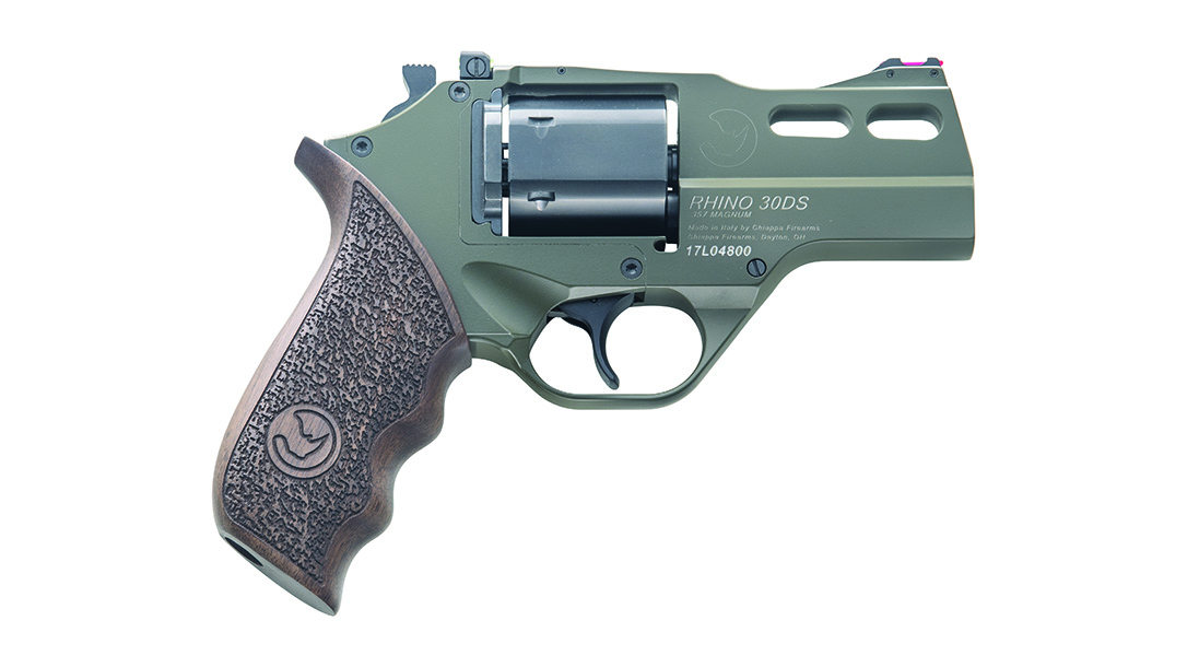 Chiappa is now offering its Rhino 30DS with an olive green frame and barrel shroud. This six-shot, 3-inch-barreled, .357 Magnum revolver has a fiber-optic front sight and an adjustable rear sight. Like all Rhino revolvers, it has a double-action/single-action (DA/SA) firing mechanism and fires from the bottom chamber in the cylinder, which causes it to have much less muzzle rise.