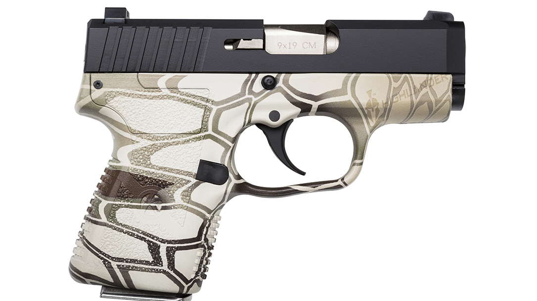 This variation of the value-priced CM9 from Kahr is distinguished by its Kyrptek camo polymer frame and Cerakote Armor black slide. Like all other CM9s, it is very small and lightweight. It’s 5.42 inches long, 4 inches tall, 0.9 inches thick and has a 3-inch barrel. It weighs only 15.9 ounces unloaded and has a 6+1 capacity.