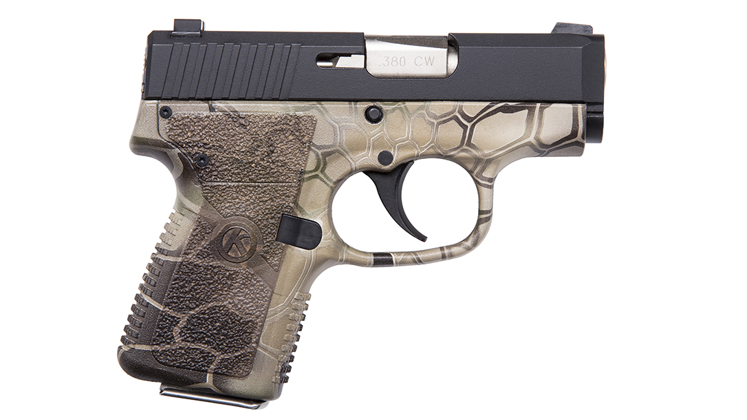 This variation of Kahr’s ultra-compact CW380 also has a Kryptek camo polymer frame and a Cerakote Armor black slide. It is both smaller and lighter than the “CM” series gun with the same color scheme. It is 4.96 inches long, 3.9 inches tall and 0.75 inches wide. It weighs a little less than 12 ounces with an unloaded magazine but it still holds 6+1 rounds of .380 ACP ammunition for a fighting chance.