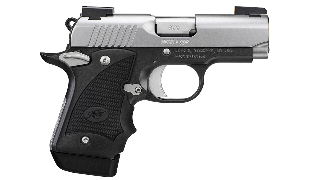 Kimber’s new Micro 9 CDP (DN) is a scaled-down 9mm 1911 with a Hogue Wraparound grip and TruGlo Pro TFX day/night sights. It also has a “carry melt” treatment so there are no sharp edges to cut hands or abrade clothing—a very desirable feature for a concealed-carry gun. The CDP (DN) also has an aluminum frame and a matte stainless steel slide. and it’s 6.1 inches long, 4.07 inches tall and 1.08 inches wide. Even so, it has a 3.15-inch barrel and holds 7+1. Unloaded, it weighs 15.6 ounces.