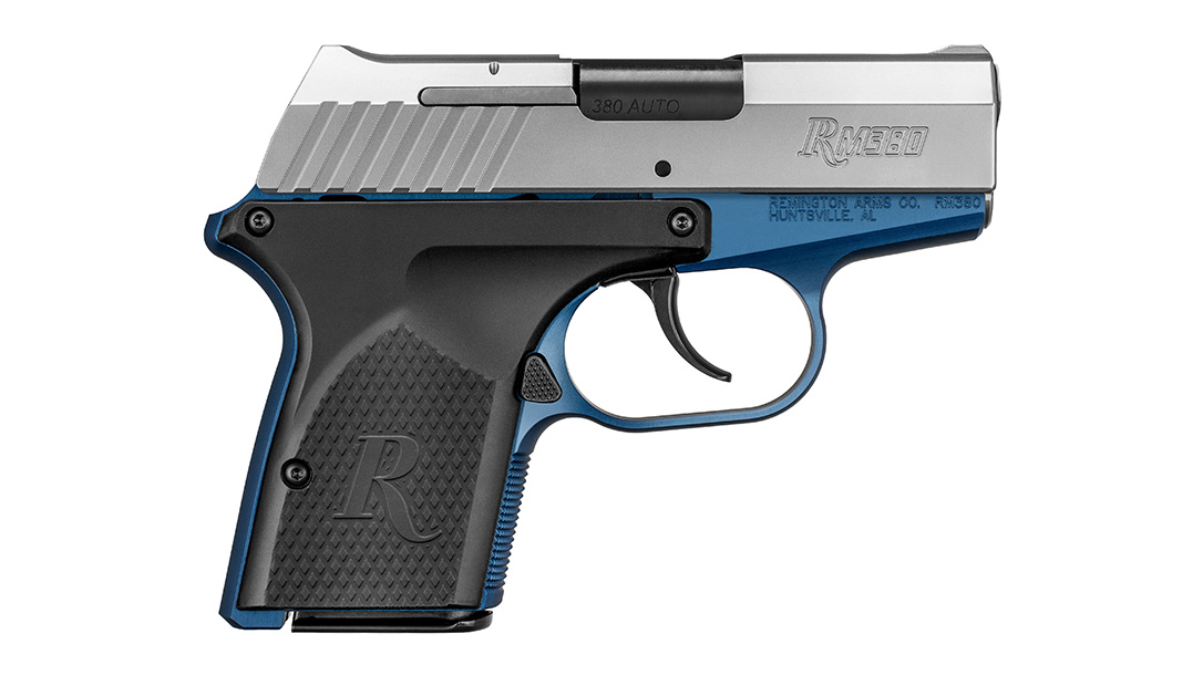 Remington’s new offerings for 2018 recognize that today’s shooters aren’t always attracted to guns that have matte black or stainless finishes. Many gun owners long for the days when firearms looked more like works of art and a lot less like something that came out of a tool box. Therefore, Remington is now offering the RM380 with a light blue frame and a black slide, or a medium-blue frame and a silver slide.