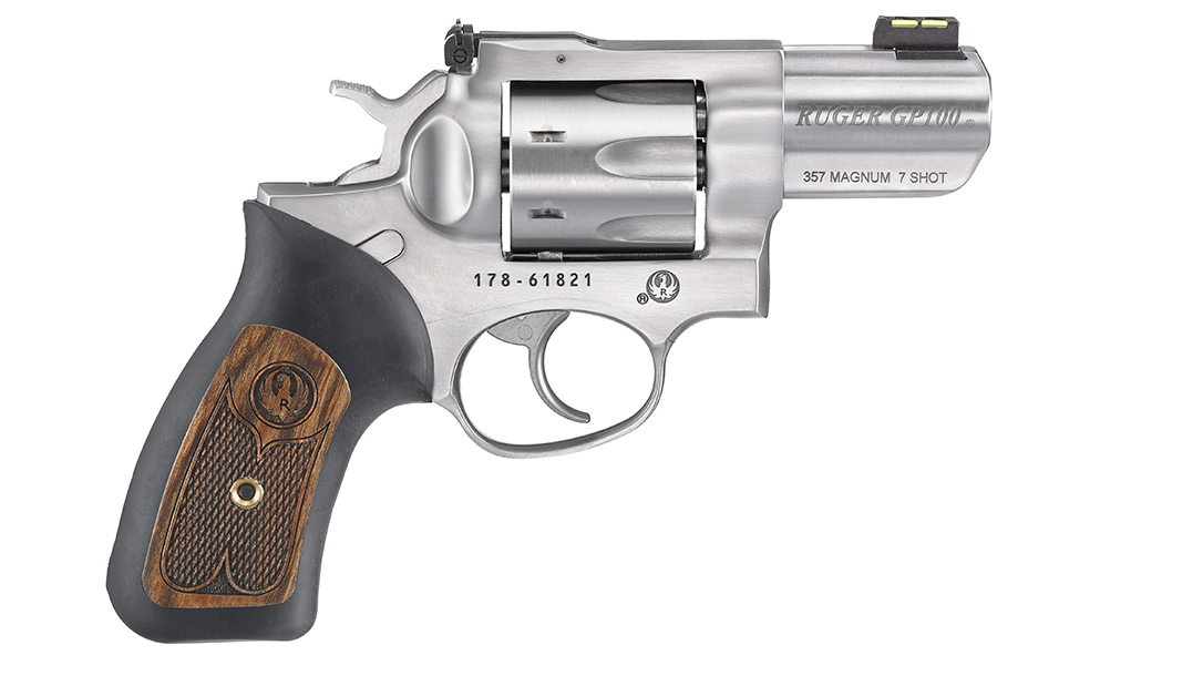 Ruger is now offering standard production versions of the GP100 in .357 Magnum with seven-shot cylinders. Available with a 2.5-, 4.2- or 6-inch full-underlug barrel, they each weigh between 36 and 43.5 ounces unloaded and measure from 8 to 10.38 inches long overall. Standard features include fully adjustable rear sights, fiber-optic front sights and cushioned rubber grips with hardwood side inserts.