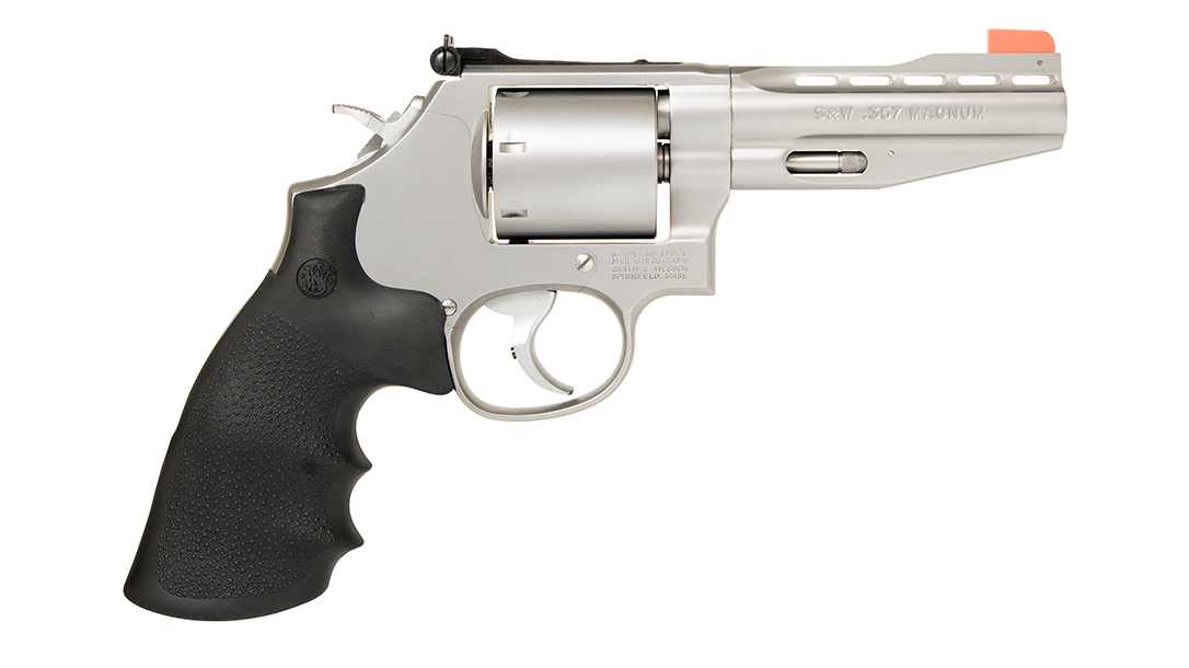For 2018, the S&W Performance Center is offering two stainless.357 Magnum L-Frame revolvers: one with a 4-inch barrel and six-shot cylinder, and the other with a 5-inch barrel with seven-shot cylinder that takes moon clips. Both have competition-ready features such as vent-ribbed barrels, unfluted cylinders, chromed teardrop hammer spurs, speed-release thumbpieces, adjustable rear sights, interchangeable orange front sights and Hogue grips.