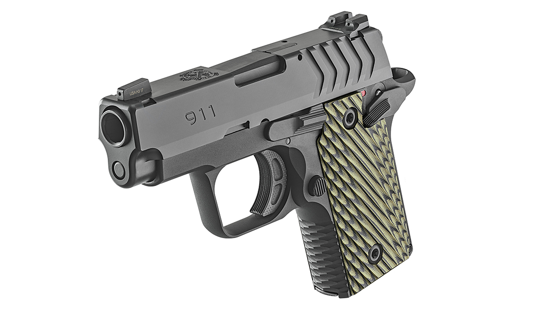 Springfield’s new 911 is a 1911-style .380 ACP semi-auto that is just 5.5 inches long, 3.9 inches tall and weighs only 12.6 ounces unloaded. The 911’s slide is 416 stainless steel, which can be had with a stainless or black nitride finish, and the frame is 7075-T6 aircraft-grade aluminum frame. The 911 comes with both a flush-fitting six-round magazine and an extended seven-round magazine. It also has G10 grips that provide excellent control. Finally, the 911 comes with Pro-Glo front and rear tritium sights, and Springfield will soon offer a version with a Viridian green laser.