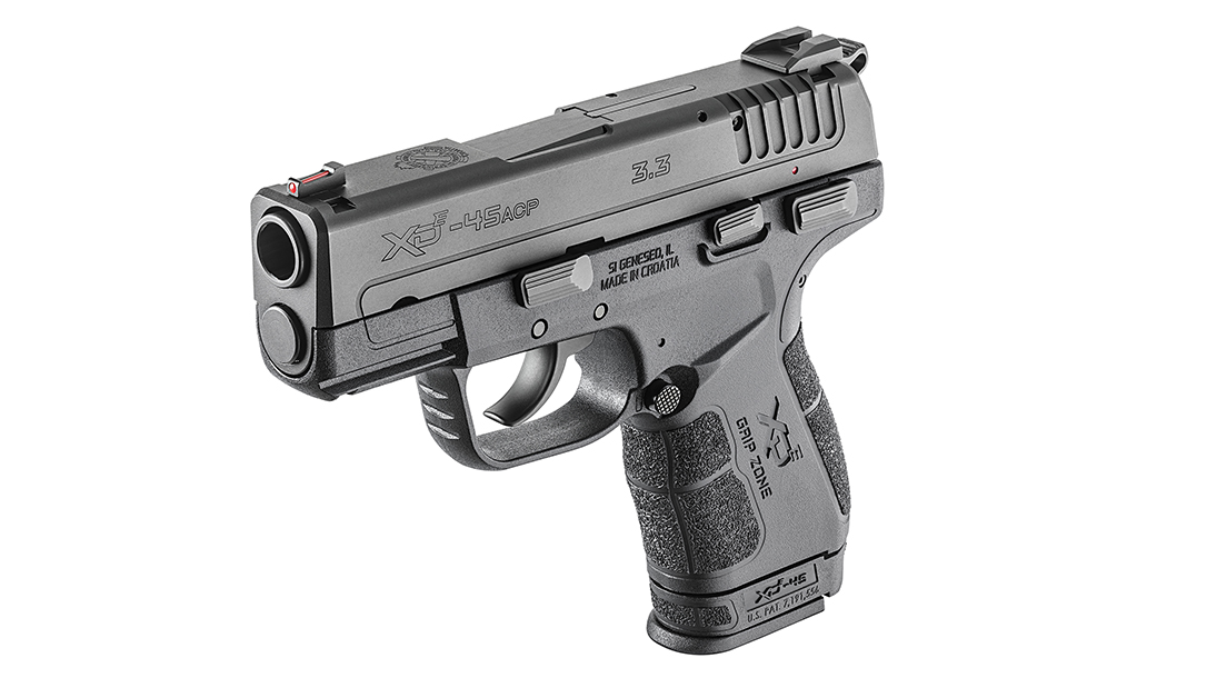 This January, Springfield introduced a new 3.3-inch-barreled .45 ACP version of its hammer-fired XD-E. This DA/SA pistol is 6.75 inches long, 5 inches tall, 1-inch wide and weighs 23 ounces unloaded. It comes with a six-round magazine as well as a seven-round magazine with a Mag X-Tension. The slide has a Melonite finish, and the frame is made from textured polymer. The fiber-optic front sight is paired with a low-profile, two-dot rear sight. Finally, the XD-E has a manual thumb safety/decocker.