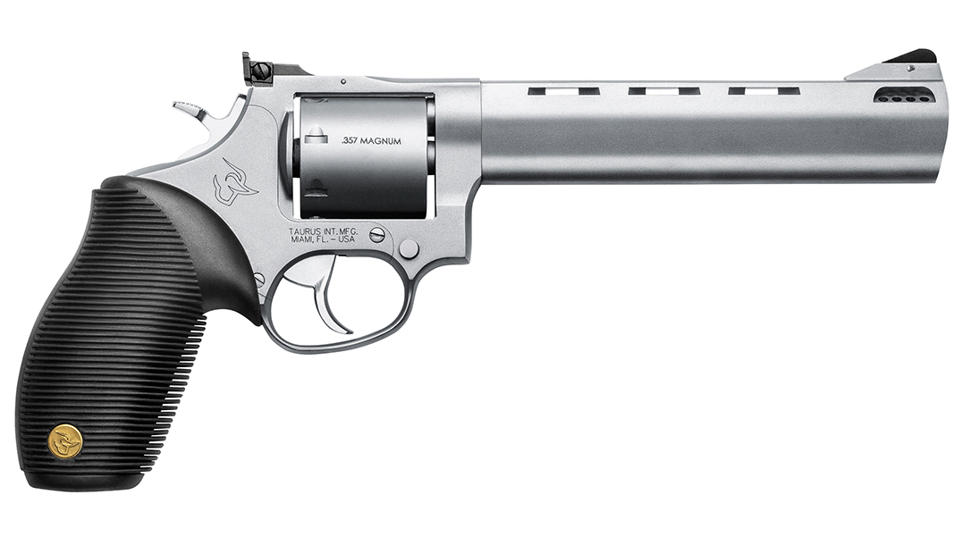 An exciting addition for 2018, this is a seven-shot, medium-frame .357 Magnum revolver in stainless or matte black that, with a simple cylinder change, can be converted to fire 9mm rounds using Taurus’ Stellar clips. It’s a traditional DA/SA design with a fixed ramp front sight, an adjustable rear sight and a black “Ribber” grip. Taurus offers the revolver with either a 3- or 6.5-inch barrel.