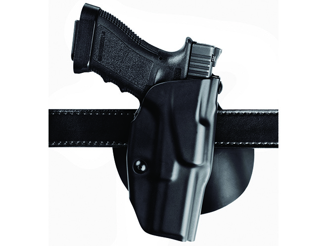 The ARS Stage 1 carry holster is a paddle design that is easy to take off or put on for everyday carry. It also features Hogue’s Automatic Retention System (ARS), which prevents unauthorized use, theft or disarmament. The ARS instantly engages when the gun is holstered. Still, the system allows for a fast draw, as a natural grip will place your thumb right on the thumb-release tab that unlocks the holster. For those who prefer belt carry, a belt plate is also included.