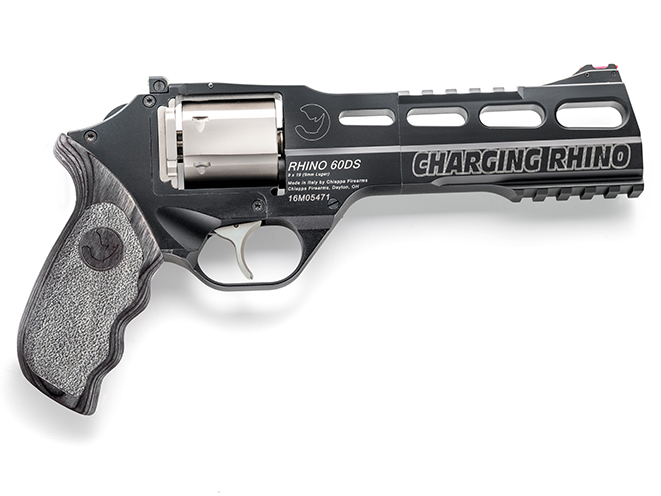 Chiappa’s Charging Rhino was designed in cooperation with IPSC and ICORE shooters. This double-action-only, 9mm, six-shot revolver has a specially tuned trigger, a fiber-optic front sight, an adjustable rear sight and a 6-inch barrel. It comes with ten 9mm moon clips for quick reloads.