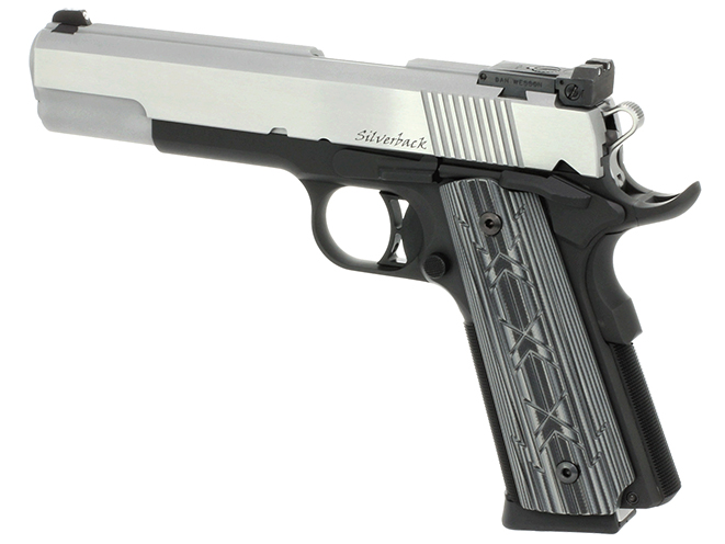 The Silverback is a two-tone pistol with a stainless steel slide and a black nitrided steel frame. This well-built, 5-inch-barreled 1911 comes in both 9mm and 10mm and has many custom features, including adjustable Trijicon night sights, a glare-reducing Clark-type top rib, a square-butt grip, 25-lpi checkering on the frontstrap and mainspring housing, G10 grips and a lowered ejection port.