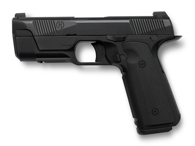 The 15-shot, 9mm H9 is a brand-new introduction from Hudson Manufacturing in Temple, Texas. This unusual pistol combines a striker-fired ignition system with a 1911 grip angle and a 1911-style trigger that has a built-in safety. Designed to accommodate a broad variety of shooters, it features ambidextrous controls and a removable lower backstrap. It also has a Trijicon HD front sight and a built-in dust cover rail for lights and lasers. Unique among its features are its low bore axis and lowered recoil spring.