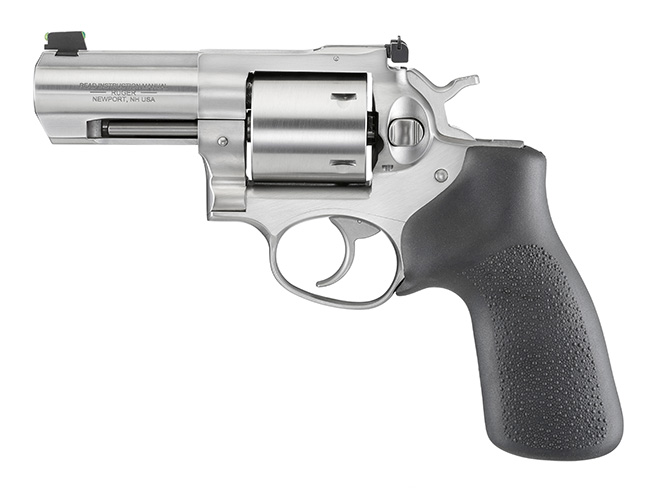 Widely considered one of the most rugged DA/SA revolvers on the market, the GP100 is now available in .44 Special. Although it has never enjoyed the same immense popularity as the .38 Special, the .44 Special is nevertheless a viable self-defense round. This GP100 is fitted with a comfortable Hogue grip to attenuate felt recoil. On top, a front fiber-optic sight is matched to an adjustable rear sight for accurate shooting in a wide range of lighting conditions.
