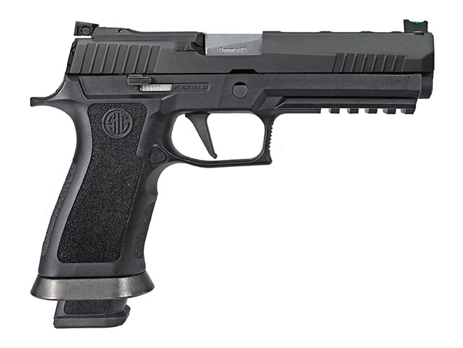 Sig has introduced a new, full-sized version of the P320 with a few X-Series enhancements. This new gun is available in 9mm and .40 S&W. It has the new “X” grip module, an extended removable magazine well, a 5-inch bull barrel, a Dawson adjustable rear sight, a fiber-optic front sight and an extended slide release.