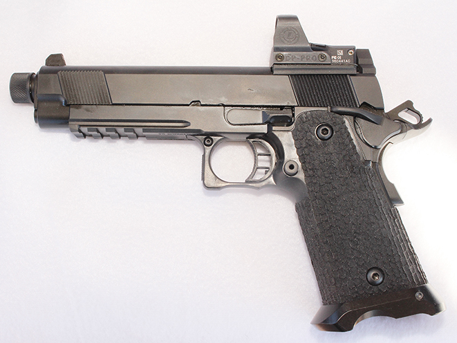 STI is now offering both single-stack (SS) and double-stack (DS) variants of the HOST 5.0, which comes with a 5-inch barrel in 9mm, 10mm or .45 ACP. It is pre-milled for an optical sight, has a 4.5-pound trigger, an ambidextrous thumb safety, tall tritium suppressor sights, a DLC finish, textured grip panels and a threaded barrel for mounting a suppressor.