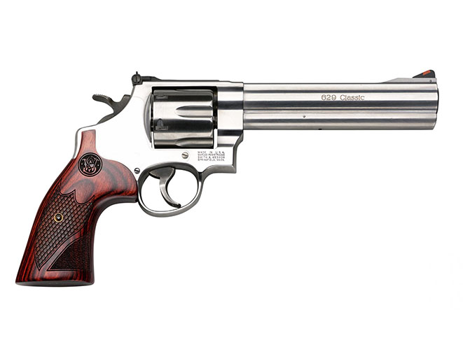 This is a stainless steel, six-shot revolver from Smith & Wesson with a 6.5-inch barrel and a square-butt grip. Both of these features will help shooters control the felt recoil of heavier 300-grain .44 Magnum loads used for big-game animals like large black bears and elk. The gun features classic sights, including a red ramp front and a white-outlined rear, that have gained a reputation for quick, accurate targeting.
