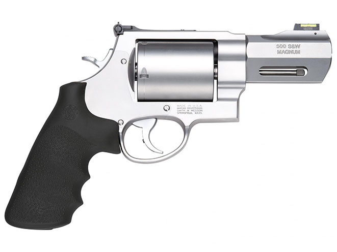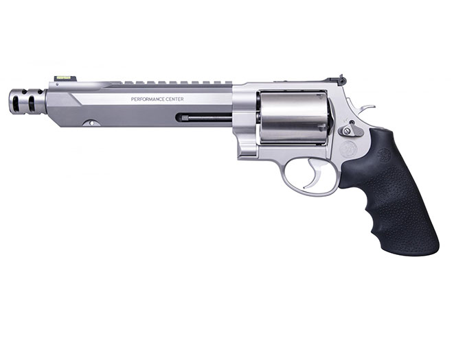 This new five-shot revolver from S&W’s Performance Center is chambered in .460 S&W Magnum, which makes it extremely versatile since it can also shoot .45 Colt and .454 Casull hunting loads. This allows the hunter to closely tailor his or her load to the game being hunted. The gun features a 7.5-inch barrel with a muzzle brake, an integral rail for optics, a tuned action, a HiViz front sight, an adjustable rear sight and a chromed teardrop hammer.