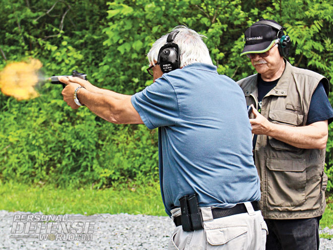 This year, the American Tactical Shooting Association’s Study Camp focused on several of these drills. All you need are targets, a T-shirt and a shot timer. Experienced shooters can practice these range drills from the holster, or the drills can be conducted from low ready if the shooter has not been trained to draw or a shooting range does not allow fast draws. The shooter should use his or her defensive firearm and load the gun with ammo that duplicates the properties of their self-defense load.
