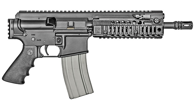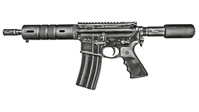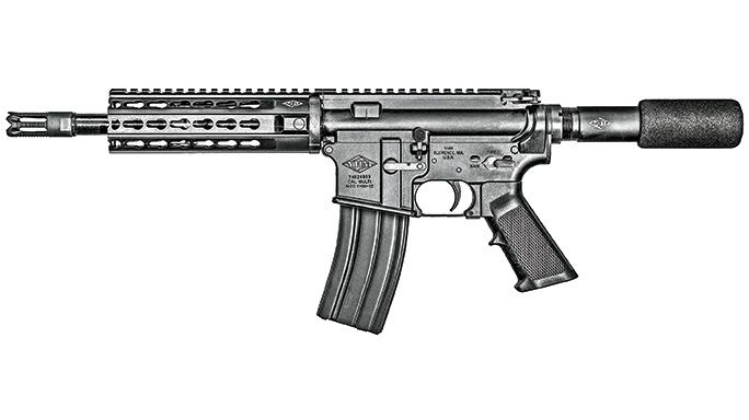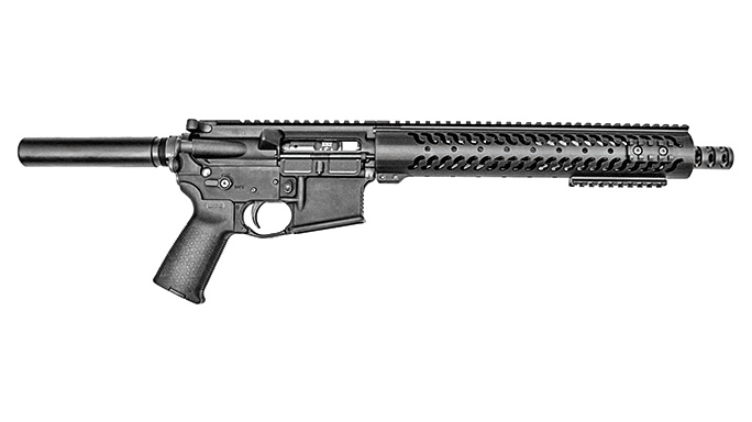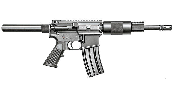 This 300 Blackout pistol is a great solution for those looking for a durable and dependable weapon that has all the benefits of being built on the AR platform. It features a round, free-floating handguard; a 9-inch, chrome-lined, chrome-moly-vanadium barrel; a buffer tube with a foam sleeve; a Hogue pistol grip and much more. (windhamweaponry.com; 855-808-1888)