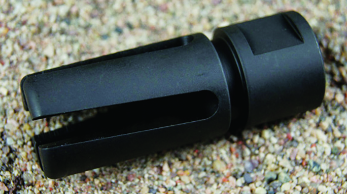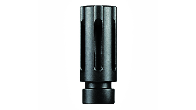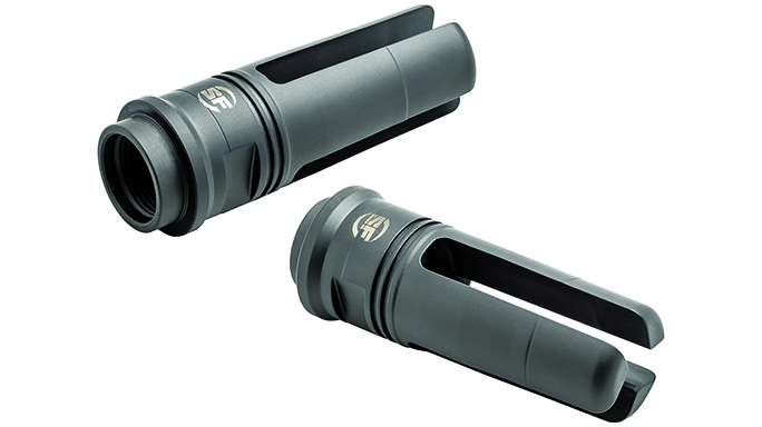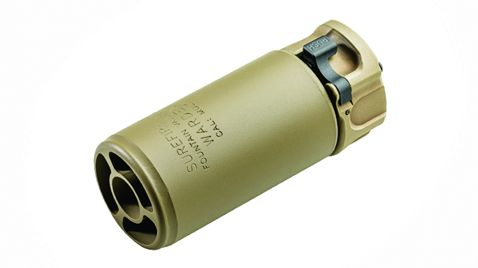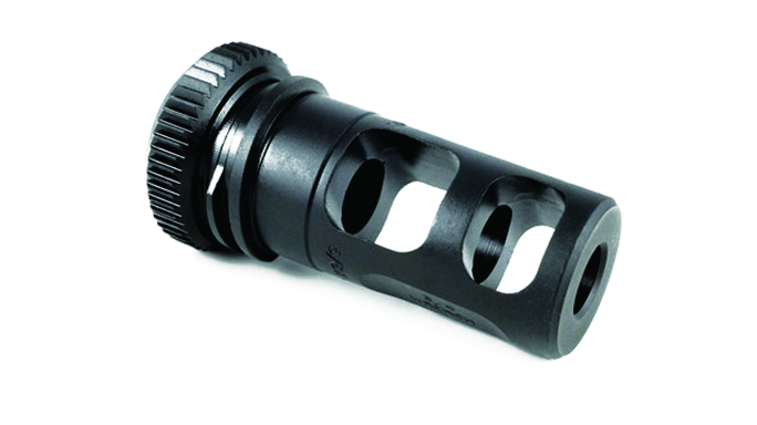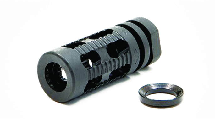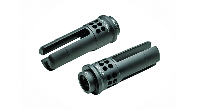 SureFire WarComp 556: One of the latest additions to the SureFire lineup is the WarComp 556, which fits AR-style weapons with 1/2×28 threads. Is patent-pending design provides over 99-percent reduction in muzzle flash compared to a plain muzzle, which helps to conceal the shooter’s location and preserve his or her dark-adapted vision. It virtually eliminates muzzle rise, and it also serves as a rock-solid mounting adapter for all SureFire SOCOM 5.56mm Fast-Attach suppressors. A 7.62mm version is also available.