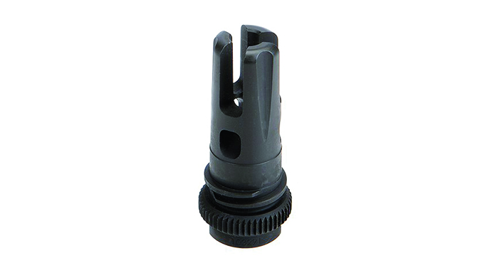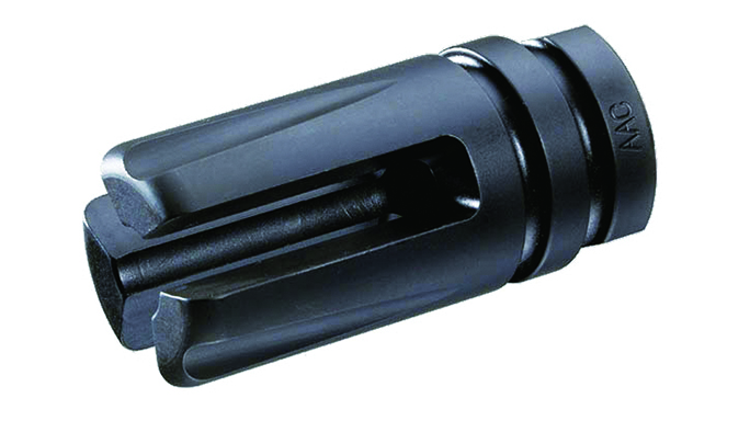 AAC Brakeout 2.0: AAC’s Brakeout 2.0 muzzle devices, available in 51T or 90T configurations, are both flash suppressors and muzzle brakes. The new symmetrical design of the Brakeout 2.0 does not need to be timed with shims like a conventional muzzle brake, simplifying the installation process. The 51T variant comes with either 1⁄2×28 or 5/8×24 threads for 5.56mm or 7.62mm rifles. The Brakeout 2.0 90T maintains the same specs but is compatible with SR5 and SR7 suppressors.