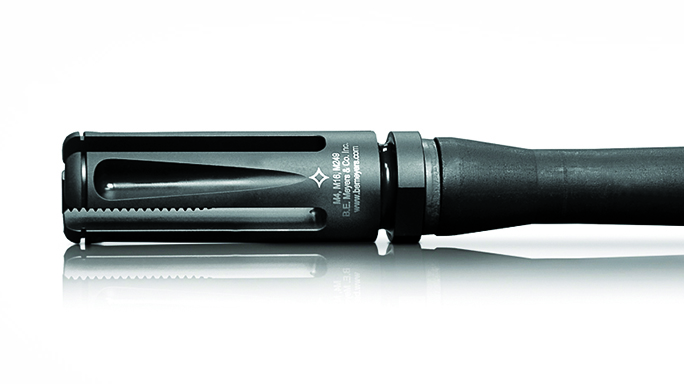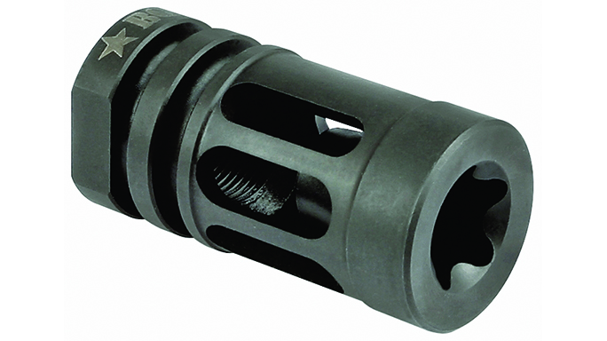 B.E. Meyers 249F: The B.E. Meyers 249F is a four-prong flash suppressor that was originally designed for military use but is now available to the civilian market as well. According to B.E. Meyers, it “virtually eliminates muzzle flash, preserving night vision while firing and preventing enemy detection of friendly positions.” It’s currently available in 5.56mm and is easy to install.