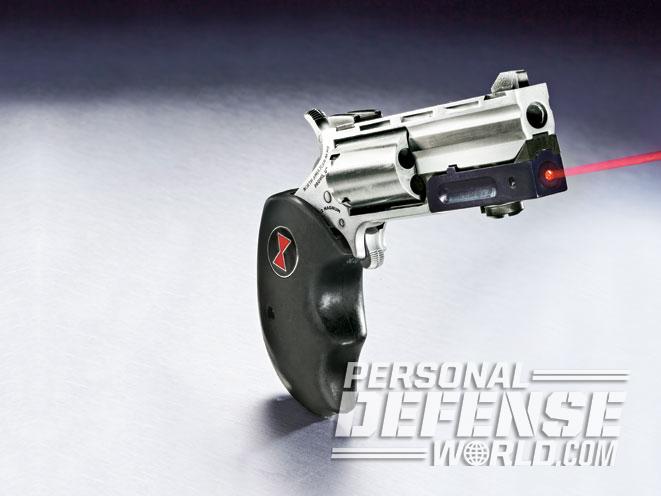 A distinctive NAA mini with a lethal name is the Black Widow. While it shares some of the features of the standard mini and Pug, it has some unique features all its own. For starters, it has a 2-inch barrel with a rib on top, into which are dovetailed front and rear sights. An elevation-adjustable rear sight is also available. Like the Pug, the Black Widow has the cylinder-pin shroud and “pull-down/turn” release. Thanks to the revolver’s longer barrel, you can also add the Venom laser sight to the Black Widow. This aluminum device replaces the cylinder-pin release and has an integrated Class IIIA, 5mw red laser. The laser will run for five hours in constant-on mode and 10 hours on pulse mode. It’s less than 2 inches in length and adds only 0.63 ounces to the revolver’s overall weight.