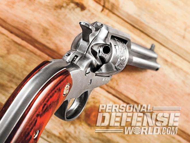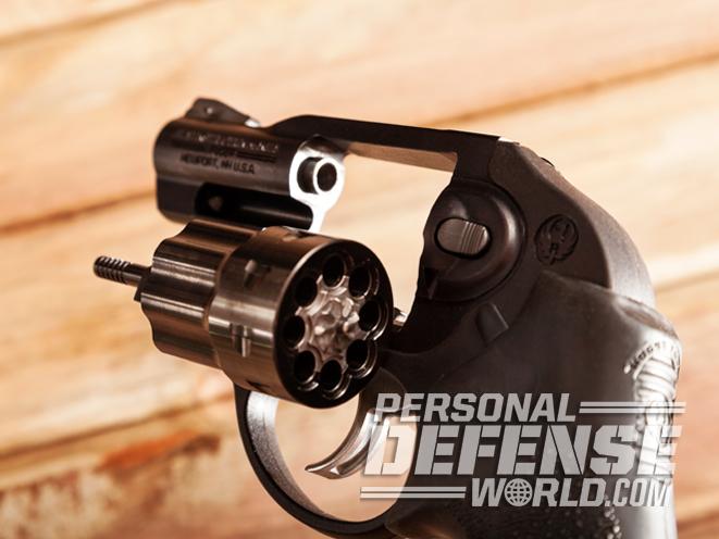 Because it’s a western-style single-action revolver, each chamber must be emptied of expended brass one round at a time, using the long ejector rod located under the barrel. Similarly, the cylinder must be manually rotated into position as each new round is inserted into each chamber. In other words, it takes longer to load (or unload) the New Bearcat than it does to charge double-action revolvers listed here. That’s not a serious consideration for a gun intended for plinking and small game hunting, rather than self-defense. (http://www.ruger.com)