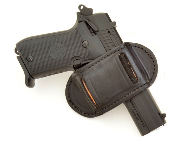 For carrying the new Chiappa .380, the best rig I found was Bianchi Frontier Gunleather’s new Auto-Quick model. The holster only surrounds the middle of the frame and triggerguard, so barrel length is not a factor here. The Auto-Quick’s design puts the wearer’s belt through loops on the front of the pouch (rather than behind it like traditional Yaqui slide styles), so the gun and holster are held closer to the waistline for better concealment. (http://www.frontiergunleather.com; 877-877-4704)