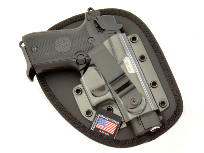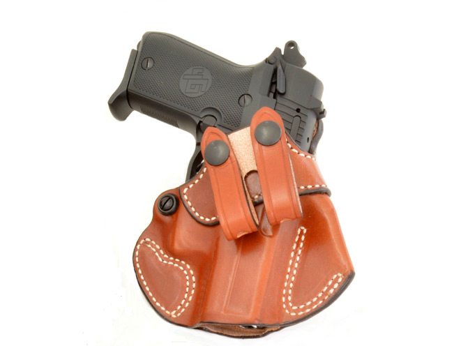 The DeSantis Cozy Partner is an excellent IWB rig with snap closure straps for easily securing the rig to the wearer’s belt. It has a slight forward cant for a smooth draw and the heavy leather throat makes reholstering easy. (http://www.desantisholster.com; 800-424-1236)
