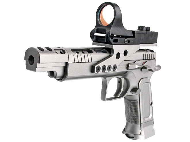The race-ready Gold Custom Eric 2010 was built to win IPSC’s Open division competitions. The pistol features a ported barrel and slide, polygonal rifling and a two-chamber compensator. (http://www.tanfoglio.it)