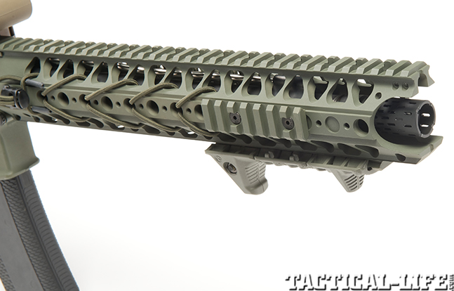 Purpose-built for professional warfighters and law enforcement officers expecting to fight in close quarters, the LVOA-S SBR is the result of a determined effort to solve flash signature and muzzle control issues inherent in an SBR without sacrificing the benefits of the design’s minimum overall length or light weight. Typically, SBR shooters fit a suppressor to the muzzle to reduce flash and allow better control, but the added hardware also increases the weapon’s dimensions, negating the original shortened design while also creating heat and carbon buildup issues. Those who avoid a suppressor and instead employ only a flash suppressor risk poor control for follow-up shots and during rapid fire. To eliminate the need for a suppressor and offer the lowest possible flash signature, the LVOA system offers a two-part solution: first, the incorporation of a BattleComp 2.0 full muzzle break pinned and welded to the end of the barrel, and second, a flash suppressor integrated in the rail system that surrounds and manages the gases from each fired round.