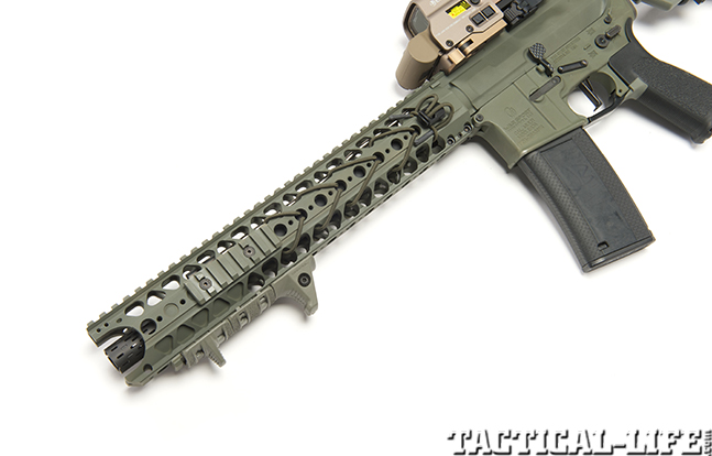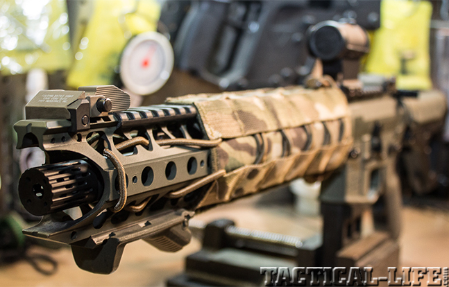 The most notable and discussed feature is a shock-cord bungee system weaved into the rail. Along with providing a means to secure cables from lights and lasers that run along the rail and allowing an improved grip while reducing the noise and harmonics of handling bare metal, the cord also provides a quick-acting muzzle suspension system. To bring it into action, the cord is extended between two points (such as the left and right passenger windows of a vehicle) and the weapon is allowed to rest in the center. The thought behind it is that, before a door can be kicked in, assaulters must travel to its location, and whether their ride is an SUV, MRAP, vessel or helicopter, the bungee provides a stable firing platform that keeps the weapon in the fight throughout without major fatigue from constantly holding it up and on target. Should the cord burn or otherwise part, it will simply pop like a rubber band, breaking away from the rail without melting to the metal.
