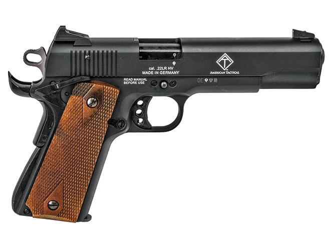 Imported by American Tactical, the German Sport Guns (GSG) 1911 .22 LR is a modern rimfire take on the classic 1911 design. In fact, it sports features on par with many custom or top-tier factory 1911 pistols on the market today. These include enhancements such as an ambidextrous thumb safety, extended beavertail grip safety, double-diamond-checkered walnut grips and a three-hole, skeletonized aluminum trigger. The frame and slide are manufactured from zinc alloy and feature a black anodized finish. Also available in tan, green and with a polished slide. The weight is on par with a standard all-steel 1911.