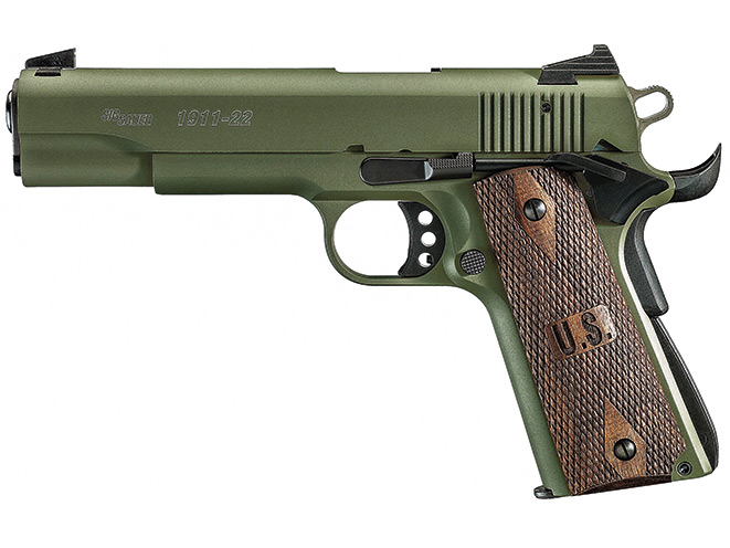 Produced in Germany, the 1911-22 is a classically styled .22 LR 1911-pattern pistol with an attractive matte Teflon-coated finish. The pistol weighs in at 34 ounces unloaded and features subtle but significant enhancements such as an ambidextrous safety and extended beavertail grip safety for enhanced ergonomics. A skeletonized aluminum trigger, attractive grips and high-visibility, three-dot sights round out the package. (Note: Sig Sauer is no longer offering the 1911-22, please check secondary markets.)