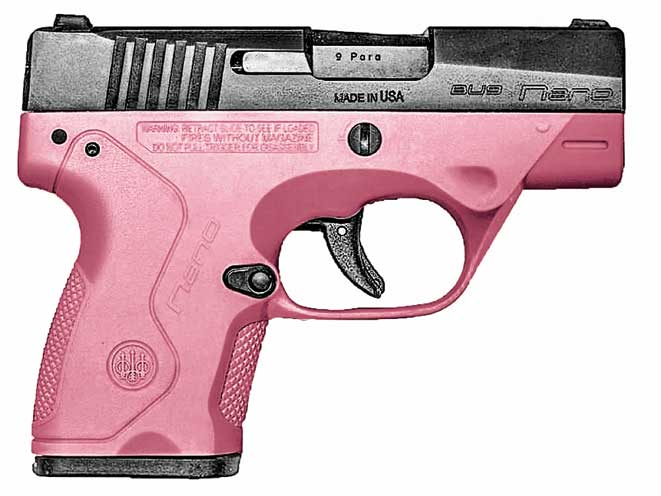 The Beretta Nano is a striker-fired, 9mm, compact handgun with a 6+1 capacity. It is available in a variety of colors, including the black and pink model shown here. MSRPs range from $445 to $452. (http://www.beretta.com)