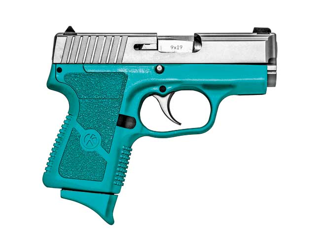 Shown here with a robin eggshell blue frame, the PM9 is a semi-automatic, locked-breech pistol chambered in 9mm.This version comes in a package through Cabela’s with three magazines (6+1 and 7+1 with extension), a black pistol rug and a pocket holster. The MSRP is $899. (http://www.kahr.com; 508-795-3919)